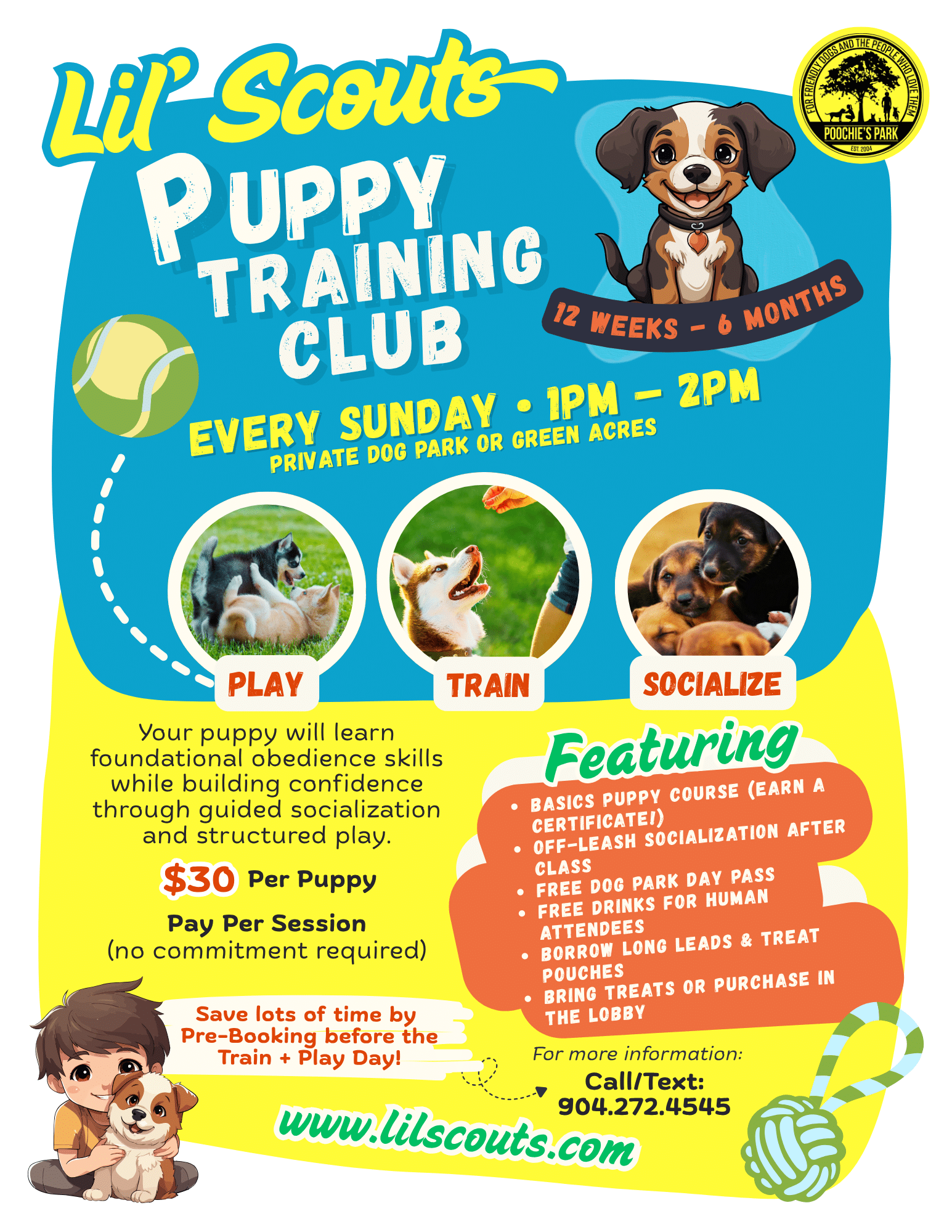 It’s Puppy Training Club Every Sunday (except Easter) from 1pm to 2pm held in the Private Dog Park Pond Rental Area or Green Acres!