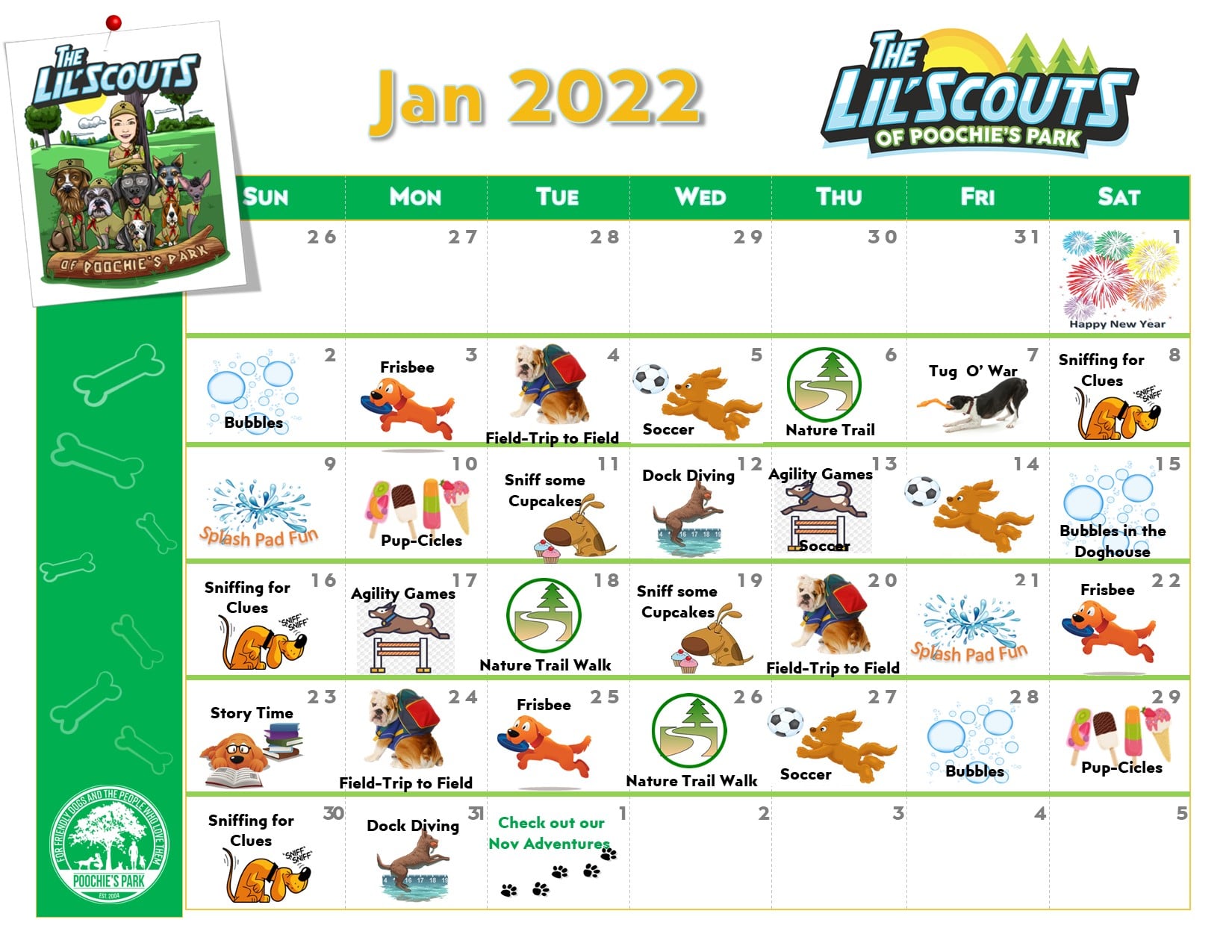 - A 30-minute adventure in a special club of only 5 dogs allowed! (This is an extra outing that is in addition to their regular playtimes!)
